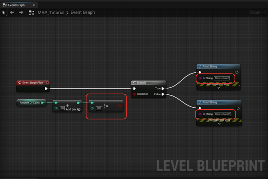 - False 핀에 다른 Print String 노드를 연결하고 **"This is False (이것은 거짓이다)"**를 작성합니다.