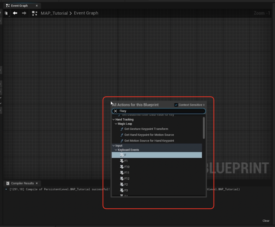 - 이벤트 키 생성: 먼저, 이 노드를 실행할 키보드 이벤트를 만듭니다. 예를 들어, F 키를 입력하고 이벤트를 생성합니다. 이제 키보드에서 F를 누르면 무언가를 할 수 있습니다.