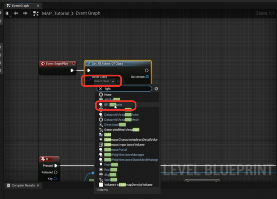 - 최종 로직: 레벨의 모든 라이트 폴을 가져온다 마지막 인덱스를 기준으로 무작위 정수를 얻는다 배열에서 무작위 정수에 해당하는 라이트 폴 액터를 가져온다 해당 액터의 조명 색상을 빨간색으로 설정한다.