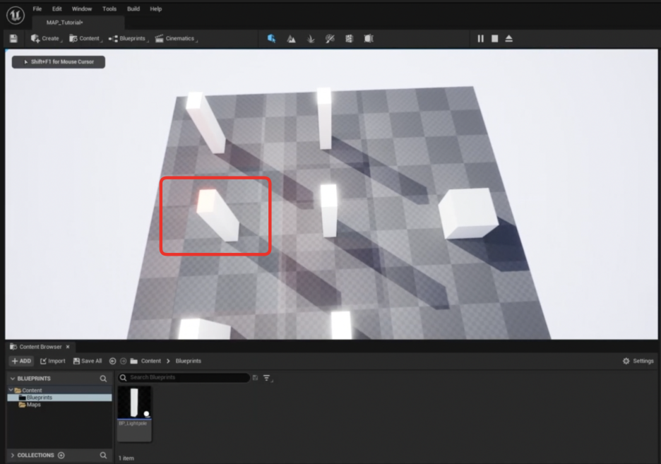 - 테스트: Play를 클릭하면, 레벨에 있는 첫 번째 라이트 폴의 조명 색상만 빨간색으로 변경되고, 나머지 세 개의 라이트 폴은 기본 색상을 유지합니다.