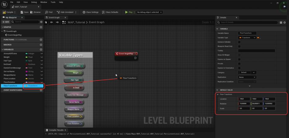 3. 값 확인: 트랜스폼 변수를 열어보면 이 안에 세트의 여러 숫자들을 볼 수 있습니다. Transform은 한 변수 안에 위치(Location), 회전(Rotation), 크기(Scale) 세 가지 값을 모두 담고 있습니다.