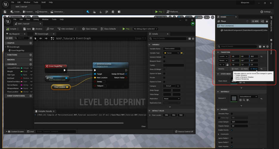 1. 액터 이동성 설정: 액터의 위치를 게임 중에 변경하려면, 뷰포트에서 바닥 메시를 선택하고 디테일 패널에서 Mobility (이동성) 설정을 **'Movable (이동 가능)'**로 변경해야 합니다.
