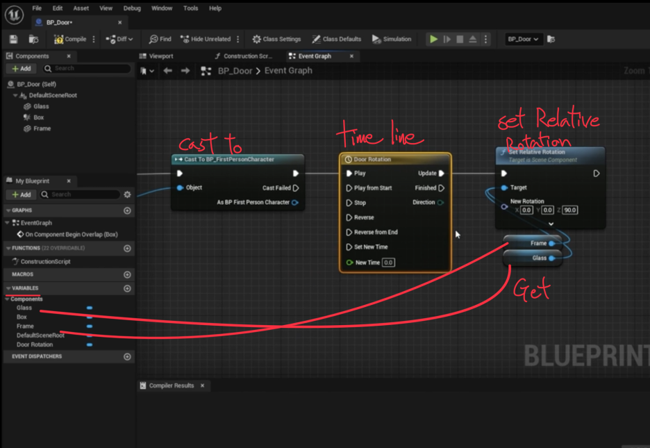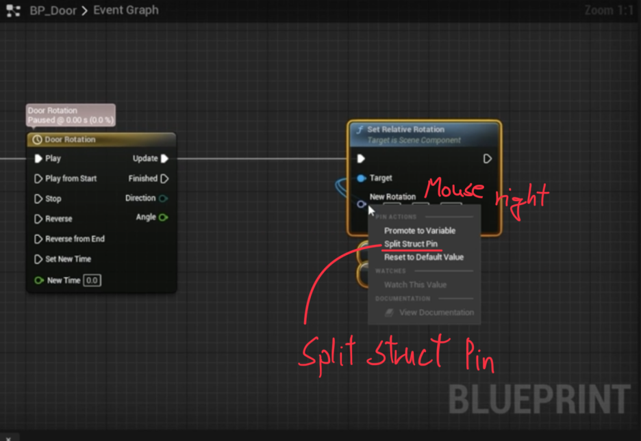 * Set Relative Rotation 노드의 New Rotation 핀에는 Timeline 노드의 Float Track 출력 값을 연결하여 문이 부드럽게 회전하도록 설정합니다.