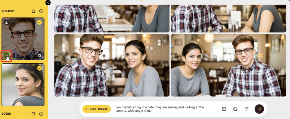 - 예시: 체크무늬 셔츠를 입은 인물 사진에서 편집 아이콘을 눌러 "노란색 셔츠를 입은 남자"라고 프롬프트를 수정하면, 소스 이미지 속 의상이 변경됩니다.