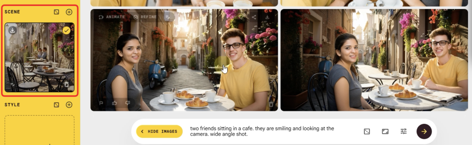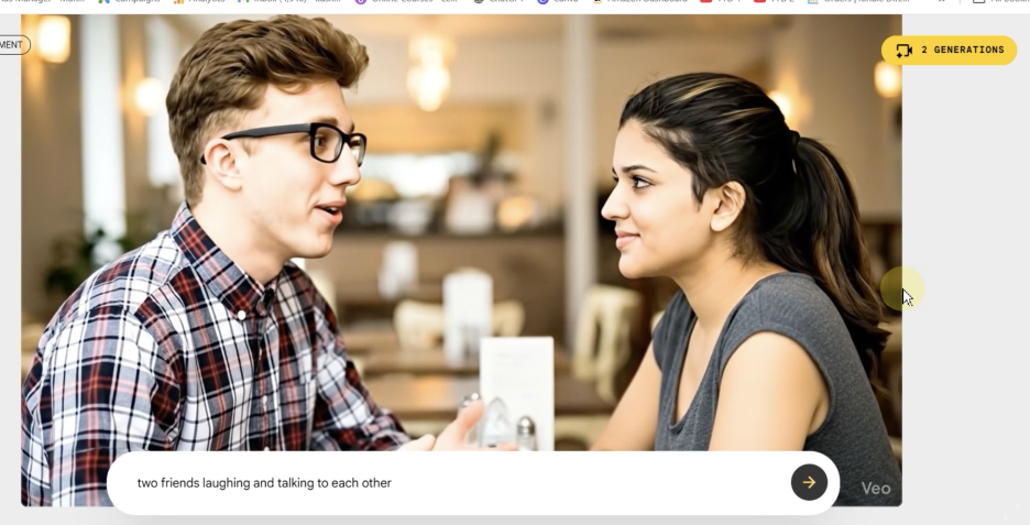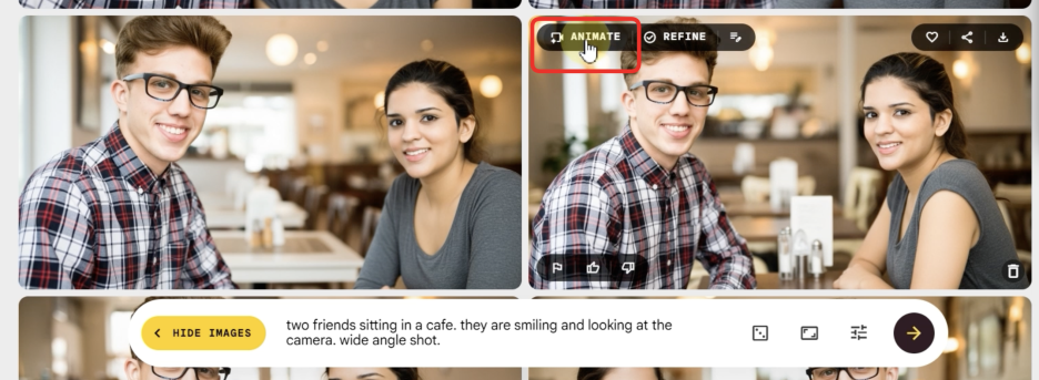 - 기능: 이미지 위에서 'Animate' 버튼을 누르고 "서로 웃으며 대화하는 두 친구"와 같은 프롬프트를 입력하면 영상이 생성됩니다.
