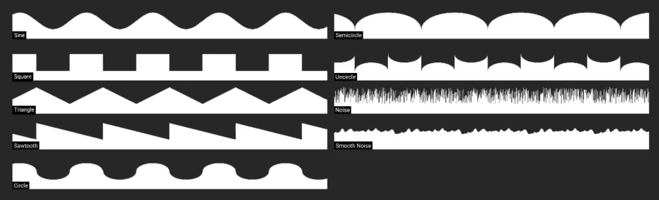 - Phase: 시드 값과 유사하며, 스피드를 0으로 설정하면 시작 지점의 파형 모양을 조절하기 쉽습니다.