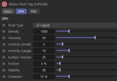 - 설명: 유체 표면의 장력을 설정합니다. 표면 장력은 유체 표면이 수축하려는 힘을 나타내며, 물방울이 구형을 유지하는 이유 중 하나입니다.