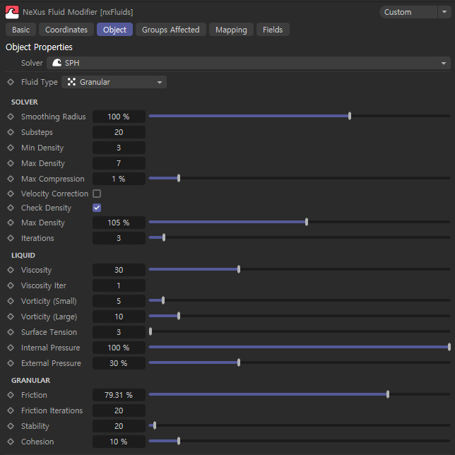 nxFluids의 GRANULAR 옵션에는 다양한 설정이 있어 입자 시뮬레이션의 특성을 조정할 수 있습니다. 각 옵션에 대해 자세히 설명드릴게요: