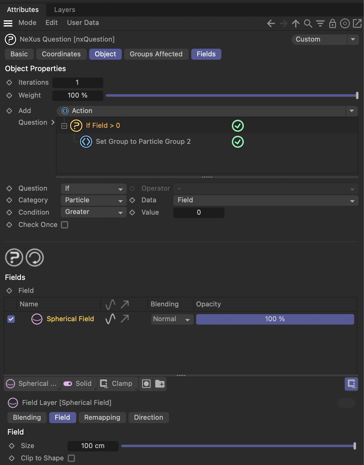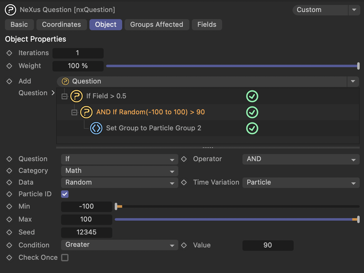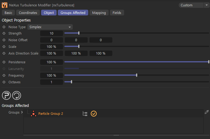 먼저 xpEmitter에서 2개의 Group을 만들고 First Group Only로 처음 Group 만 xpEmitter가 작동하게 만들어 줍니다. 그 후 nxTurbulence를 만들어 Group 2번에만 영향을 주도록 설정해주고 nxQuestion을 통해 Field 영역에 닿으면 Group 2번으로 변환해주도록 해서 nxTurbulence에 영향을 받게 만들 수 있습니다.