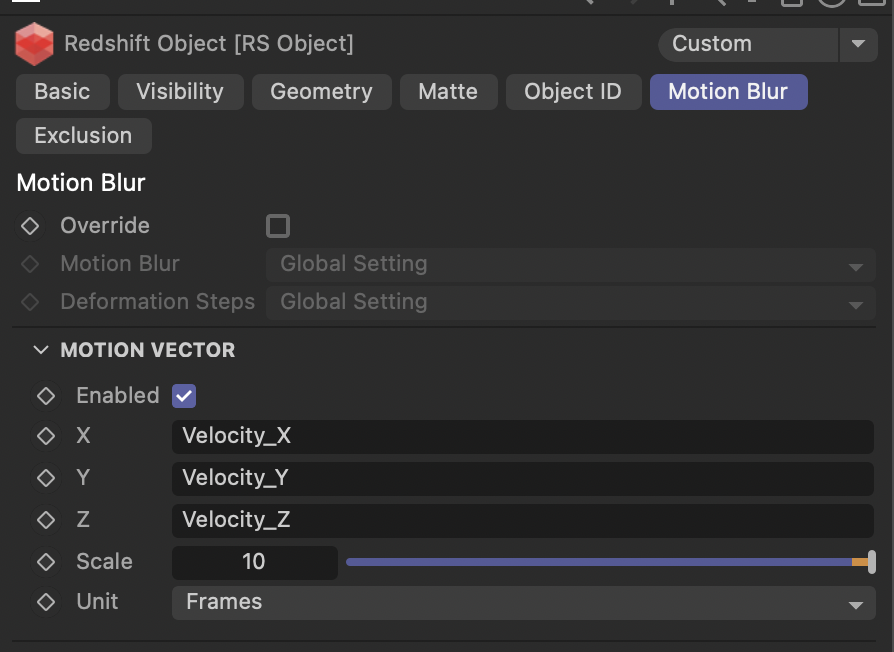 3. 이 정보를 레드쉬프트에 전달합니다. 태그 -> 렌더 태그 -> 레드쉬프트 객체 태그로 이동하여 모션 벡터를 활성화하고 맵을 링크 필드에 드래그합니다.