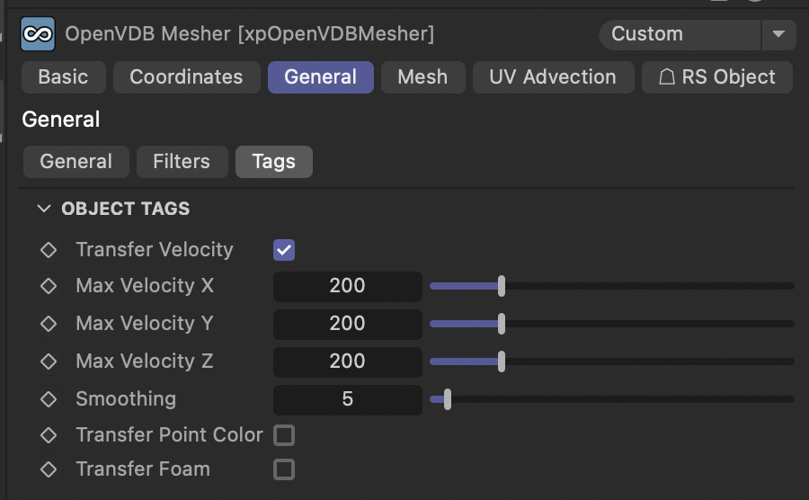xpOpenVDBMesher의 General 탭에서 Tags 섹션에 있는 다양한 옵션들에 대해 설명드리겠습니다.